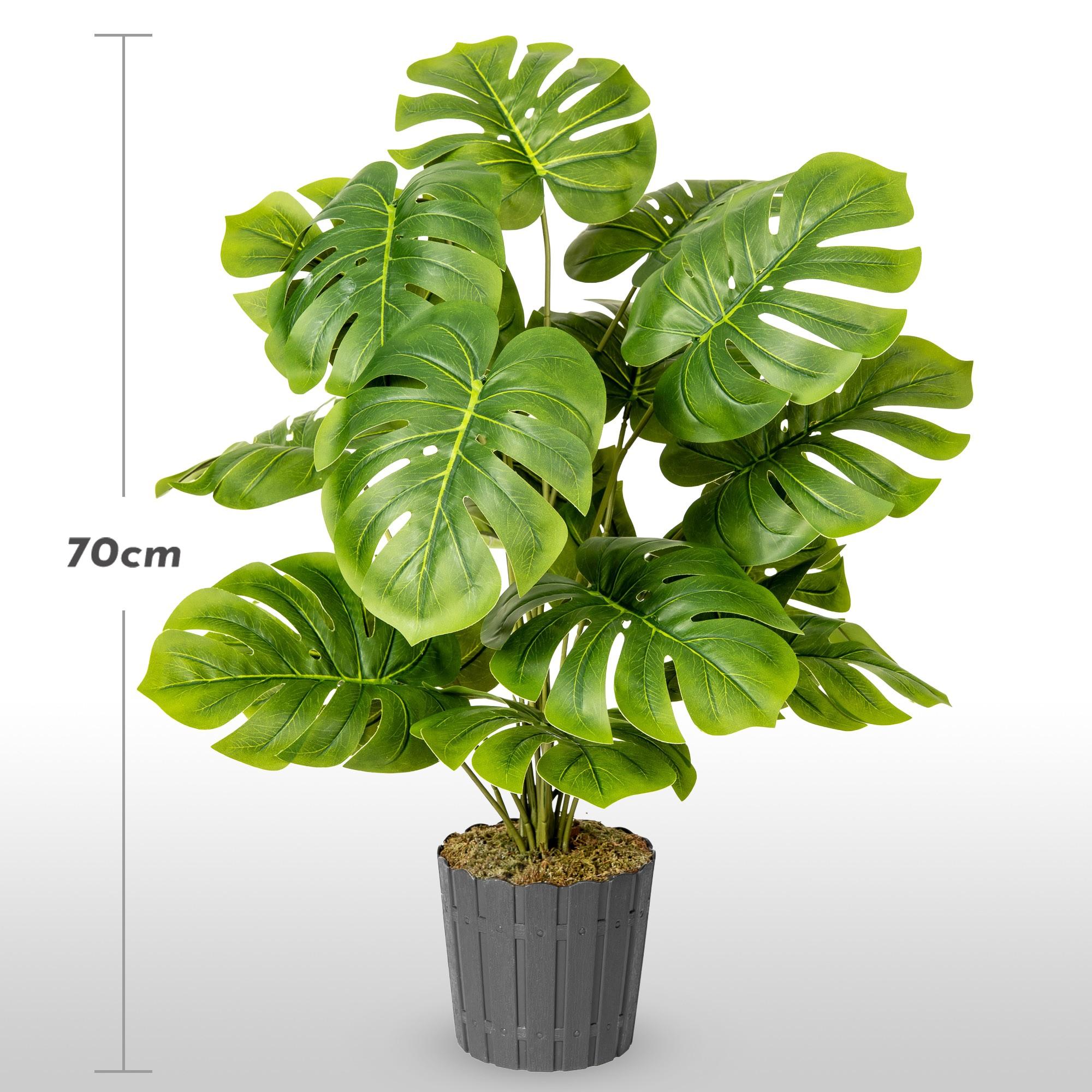 La structure en 3D des feuilles de monstera apporte de la profondeur et évite que la surface de cette plante d intérieur artificielle ne paraisse plate. Autre détail important : les tiges, dont les attaches des feuilles sont invisibles, confèrent à la plante un aspect particulièrement naturel. La plante pousse dans un pot agrémenté de mousse, ce qui confère à la partie inférieure de la composition un aspect esthétique et organique.